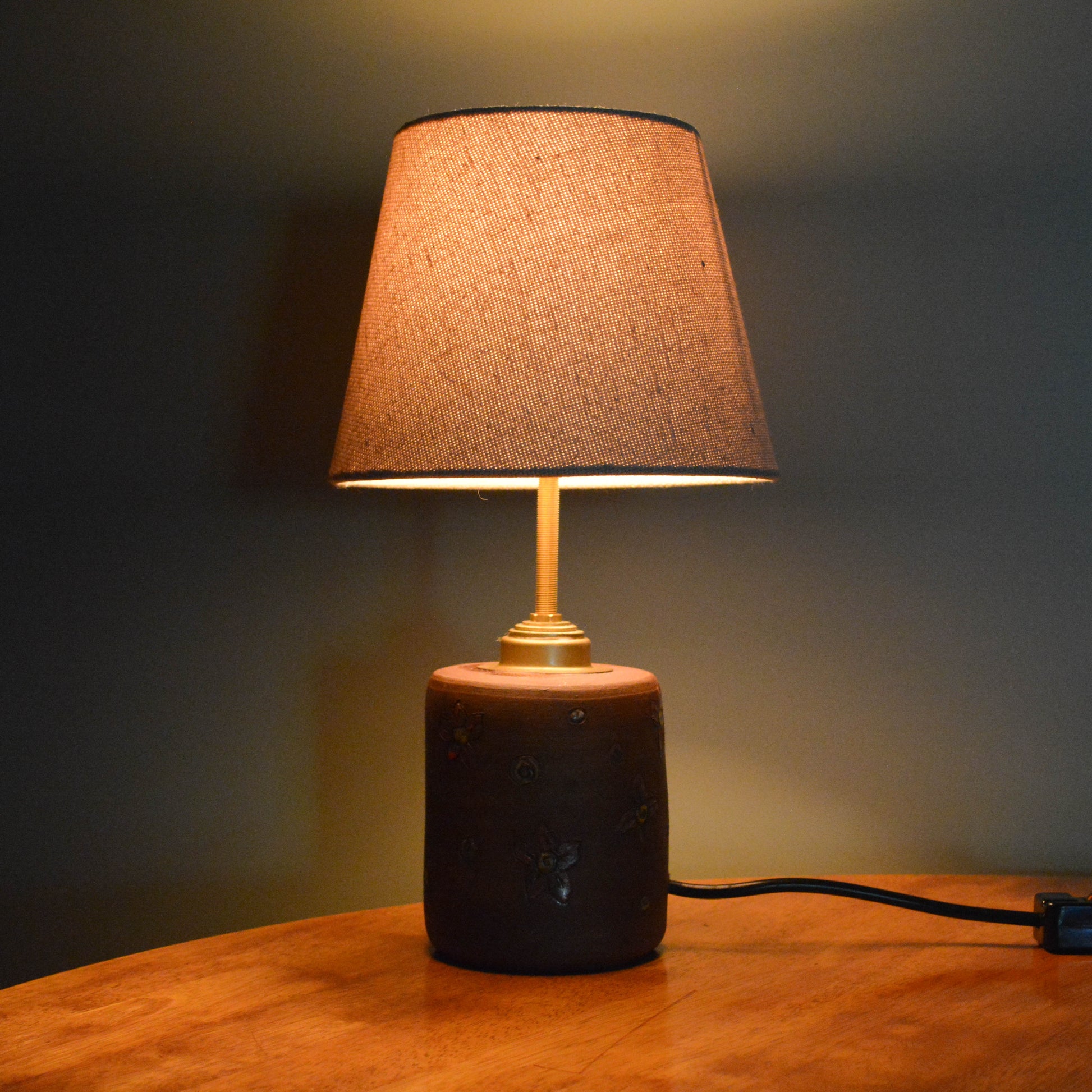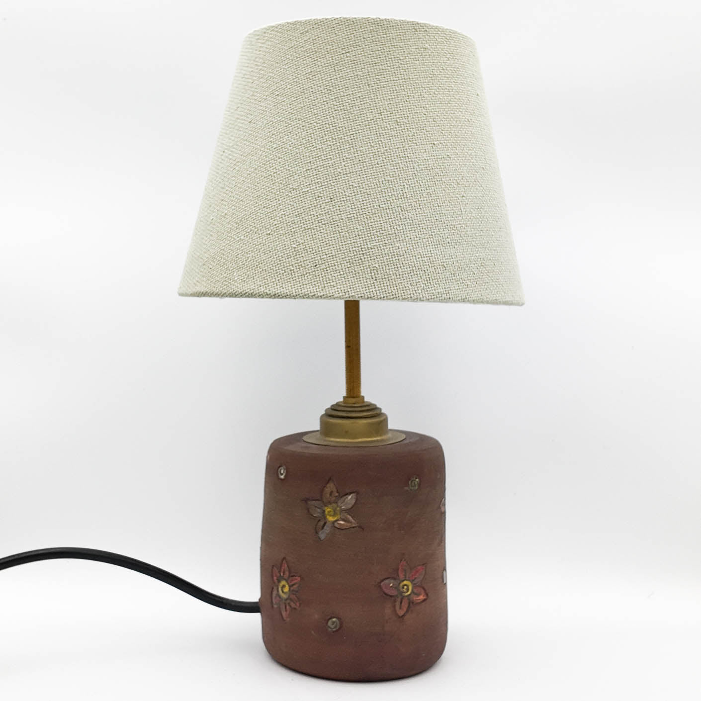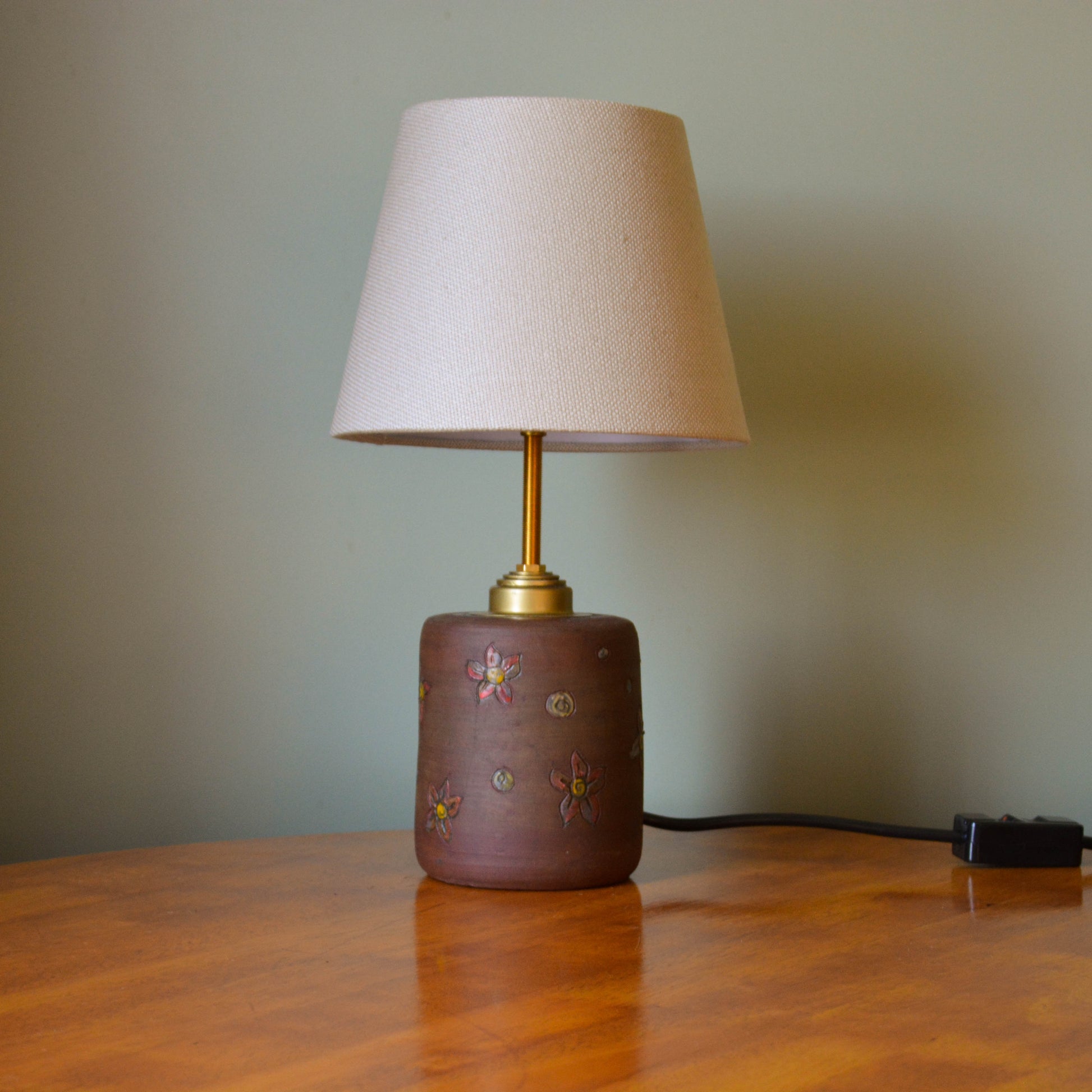 This terracotta lamp brings a grounded, earthy presence into the room. Its surface has been carefully hand-decorated, adding quiet texture and a sense of individuality to each piece. Paired with refined brass fittings and a soft Natural or Sage fabric shade, this lamp is designed to offer both light and feeling.